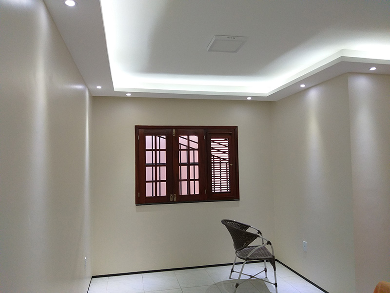 - Na sala foi feito a construção de sanca de gesso, e instalação de iluminação com fitas led e lâmpadas croique.